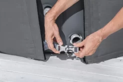De beschermhoes is zeer eenvoudig te bevestigen op je spa. De verstelbare band is voorzien van veiligheidsclips, zodat je de perfecte pasvorm voor jouw spa kunt creëren en warmteverlies wordt voorkomen. Bovendien is er een handige rits aanwezig, zodat de ingebouwde of externe pomp altijd aangesloten kan blijven. Dit is superhandig!