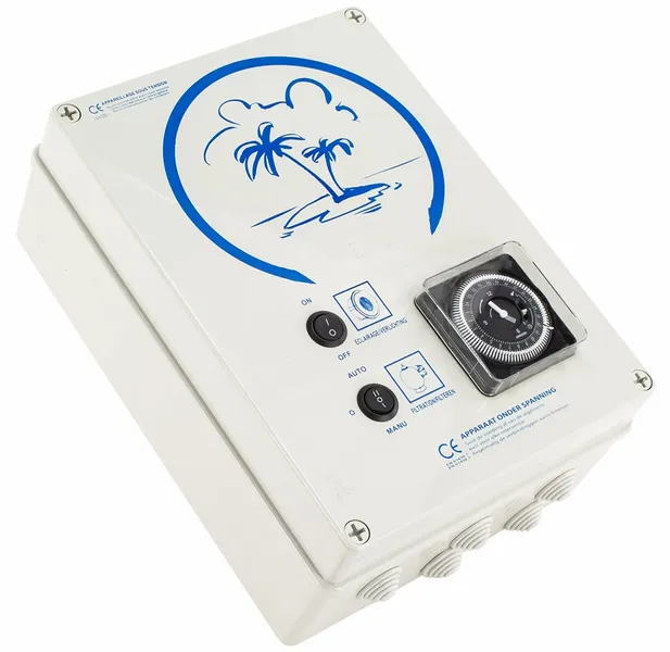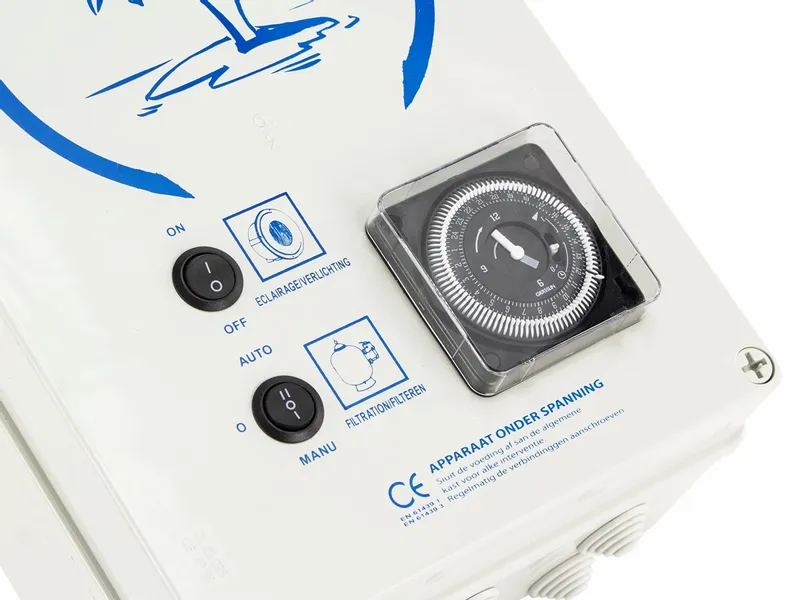 Zet je pomp, verlichting en verwarming op een automatische sturing om meer controle te krijgen over de looptijd en daarmee het energieverbruik van je installatie. Met deze uitgebreide sturingkast heb je de mogelijkheid om een dagklok in te stellen of de zwembadpomp handmatig in te schakelen door de schakelaar op de schakelkast.