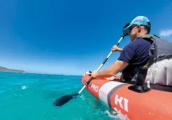 Met de meegeleverde handpomp pomp je de Excursion Pro op, totdat er een hoge luchtdruk ontstaat. Deze hoge luchtdruk zorgt samen met de platte romp ervoor dat de boot stabiel op het water ligt. De ventielen in de boot zorgen ervoor dat de kajak na gebruik ook weer snel leegloopt. De kajak is met 305 cm vrij kort en dit zorgt er samen met de 2 verschillende skegs (voor diep en ondiep water) voor, dat de boot heel wendbaar is. Handig voor veel bochtenwerk en varen op smalle rivieren!