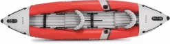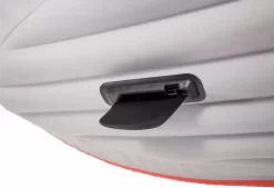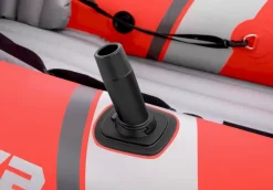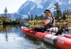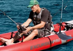 De opblaasbare kajak is geschikt voor 2 personen en een maximale belasting van 180 kg. De boot biedt veel beenruimte en comfort door zijn lengte van 3.84 meter en de ingebouwde voetensteunen. Deze voetsteunen zijn verstelbaar, waardoor je altijd comfortabel kunt peddelen. Daarnaast is de boot voorzien van opblaasbare en verstelbare stoelen met rugleuning. Deze stoelen worden geleverd inclusief Booster Pads. Dit zijn opblaasbare kussens voor een verhoogde en extra zachte zitting. Aan beide zijden zitten vishengelhouders bevestigd, wat dit model tot de perfecte vis kajak maakt. Hierdoor kun je je hengel stabiel vastzetten tijdens het vissen. Aan de voorzijden bevinden zich nog extra montagebeugels. Hieraan kun je nog een vishengel plaatsen of bijvoorbeeld een tafeltje.