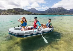 De Intex Mariner 4 is geschikt voor vier volwassenen met een maximale belasting van 400 kilogram. De Intex Mariner 4 is uitgerust met twee quick-fill/fast-deflate ventielen voor het eenvoudig en snel opblazen/leeglaten. Verder heeft de Intex Mariner 4 Set een I-balk bodem, die zorgt voor extra comfort en stabiliteit. Ook handvatten en riemsloten zijn uiteraard voorzien. De Intex Mariner 4 weegt 42 kilogram.