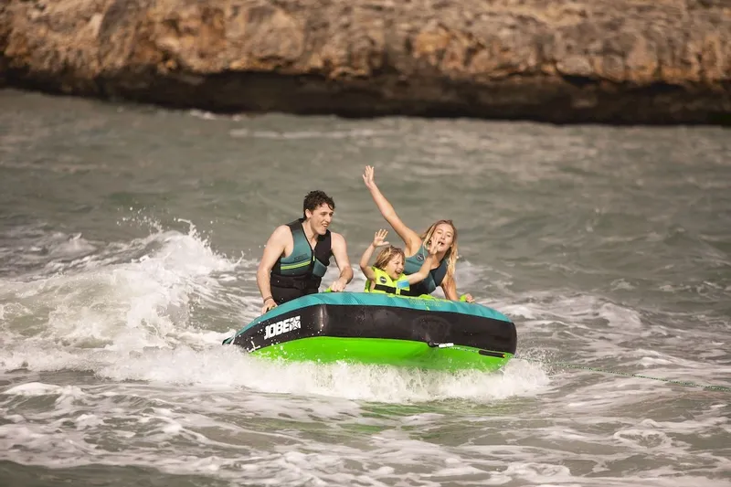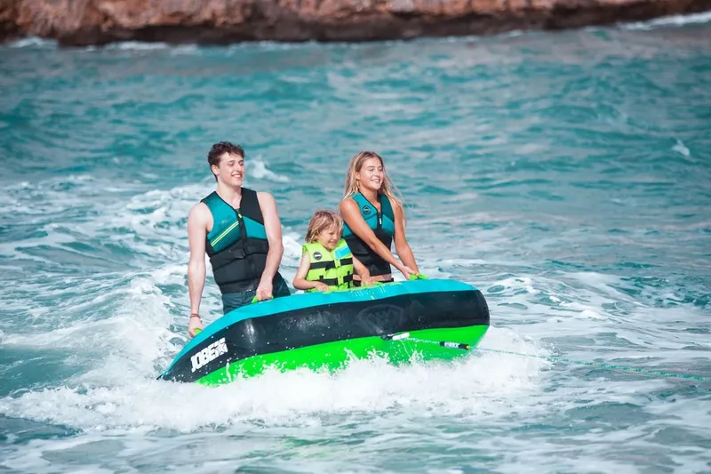 De Jobe Tribal Funtube is een funtube geschikt voor maximaal 3 personen. Doordat er 6 handvaten op de funtube zitten bevestigd kunnen zowel jij als je vrienden of familieleden zich stevig vast houden. Deze handvaten zijn ook nog voorzien van een neopreen knokkel bescherming waardoor je meer grip hebt en geen last van je handen zult krijgen. Doordat de Jobe Tribal Funtube voorzien is van een quick connector kun je heel makkelijk de funtube los en vast maken. Je hoeft namelijk hierdoor het touw simpelweg alleen maar vast te klikken aan de funtube. Met de Jobe Tribal Funtube kun je dus met familie of vrienden genieten van een lekker dagje weg op het water.