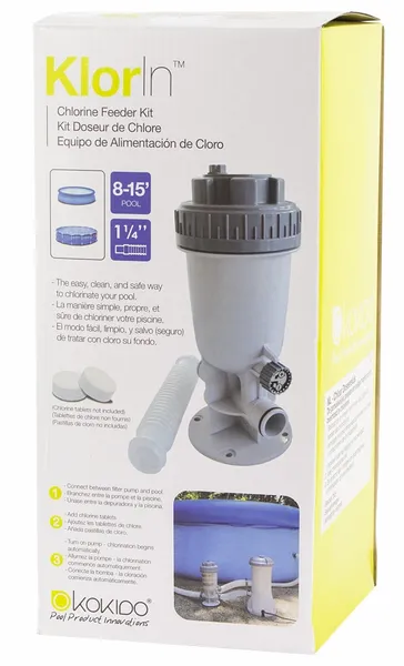 De Kokido Inline chloordoseersluizen zijn speciaal ontworpen voor het gebruik bij bovengrondse opzetzwembaden. In de chloordoseersluis kan maximaal 1 kilogram aan chloor worden gedaan. Je kunt dus bijvoorbeeld 5 chloortabletten van 200 gram in de installatie doen en je zwembad zal voorlopig wel voorzien zijn van genoeg chloor. Hou natuurlijk wel goed in de gaten wanneer het chloor bijna op is, want de doseersluis geeft niet aan wanneer je moet bijvullen.