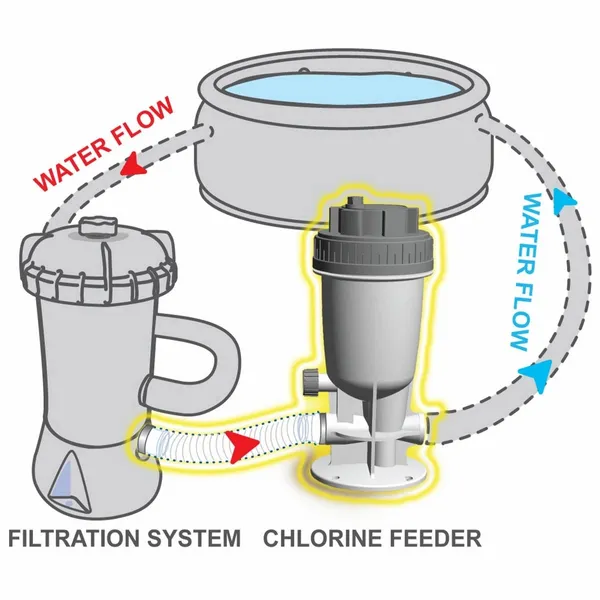 - Efficiëntie: dankzij de doseersluis wordt het chloor veel gelijkmatiger verdeeld door je zwembad heen dan bij drijvende chloordispensers