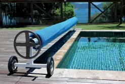 Het oprolsysteem heeft een aluminium frame, die lichtheid en sterkte combineert. Het buizensysteem is makkelijk te verstellen. Zo kun je het oprolsysteem precies op maat aanmeten voor je afdekking. De wielen van dit oprolsysteem zijn lekker groot, stevig en gripvol. Dit zorgt er niet alleen voor dat het oprolsysteem gemakkelijk te verplaatsen is, maar ook een stuk stabieler staat.