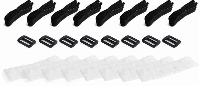 - 8 PE banden van 170 cm (let op: banden moeten omslaan om te bevestigen, waardoor de bruikbare lengte lager uitvalt)